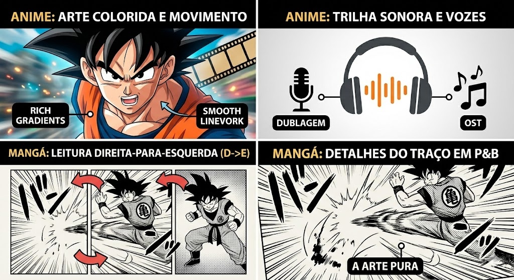Como vimos no nosso Guia Completo sobre a Cultura dos Animes, essas duas mídias caminham juntas, mas possuem diferenças técnicas e narrativas cruciais que todo fã deve conhecer.